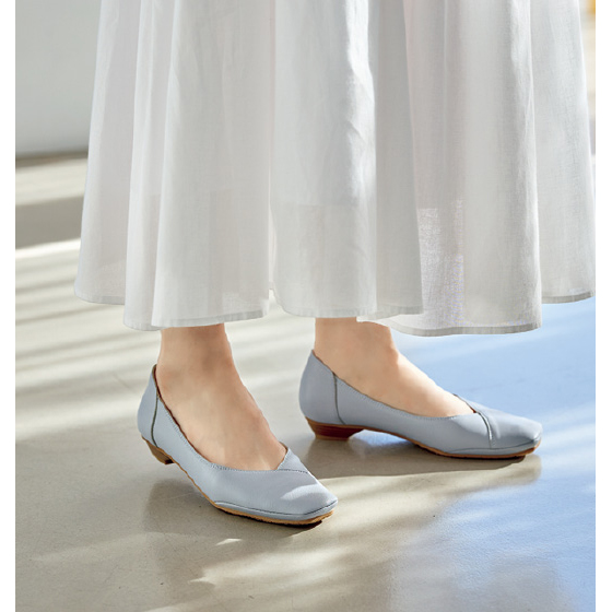 甲部分を中で袋状に、かかと部分はやわらかなクッションで包み込むことで脱げにくく、まるで靴下のような履き心地に。Vカットで足元に抜け感も。