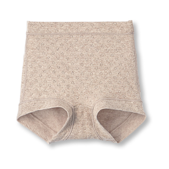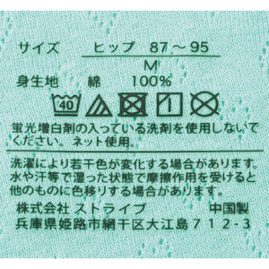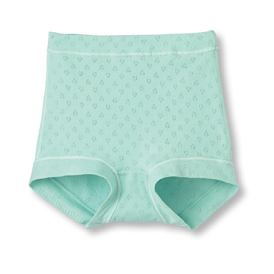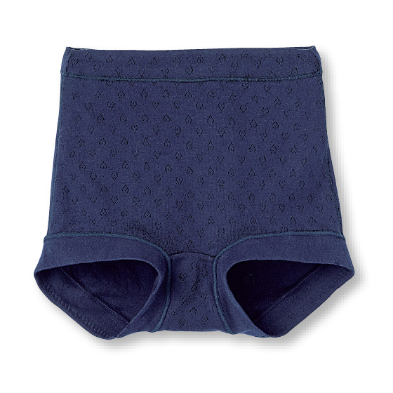 やわらかな綿100%。通気性のよいパターンメッシュで、肌にやわらか。ウエストはソフトゴムを身生地で包んだやわらかな仕様。脚口は、ソフトなパワーネットでフィット。縫いしろも縫い糸も外側に出し、肌側はなめらかな縫製でチクチクしにくい。●マチ裏は綿100%素材です。