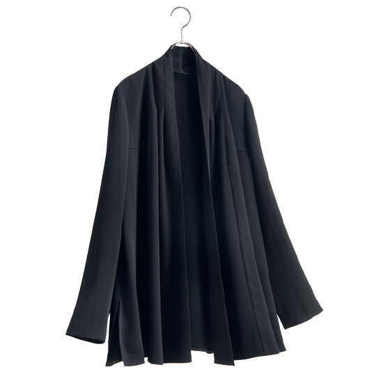 伸縮性のよい生地を使用。お手持ちの服にさっとはおって幅広いフォーマルで活躍します。裾スリットがふわっと広がり腰回りをカバー。※着用シーズンは通年です。