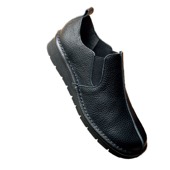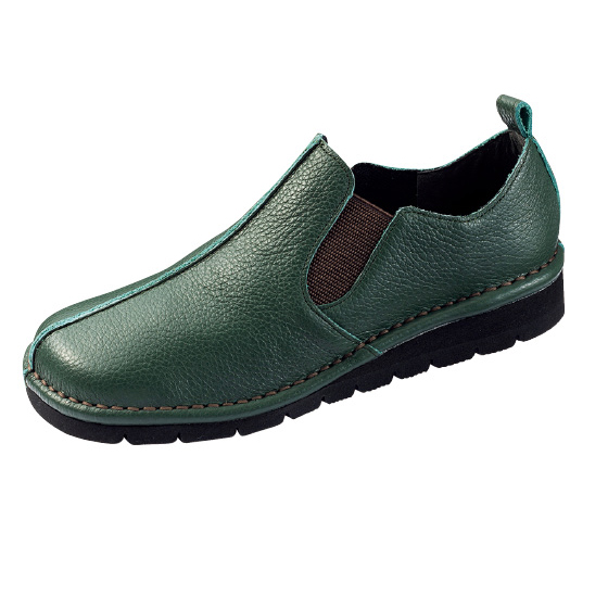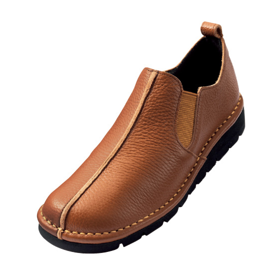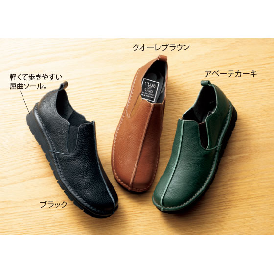 アウトステッチを施した足なじみのよい秋冬カラーのスリッポン。両サイドゴムで脱ぎ履きしやすく、屈曲性のよい適度な厚みのソールで歩きやすい仕様。パンツにもスカートにも合わせやすく、履くだけで大人らしいカジュアルスタイルに。