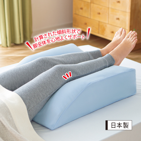 脚の屈曲に合わせた形状の、大きめサイズのクッション。脚の重さを分散させながら支えるから、ひざはもちろん腰までラク。寝ながらゆったり”休足“を。