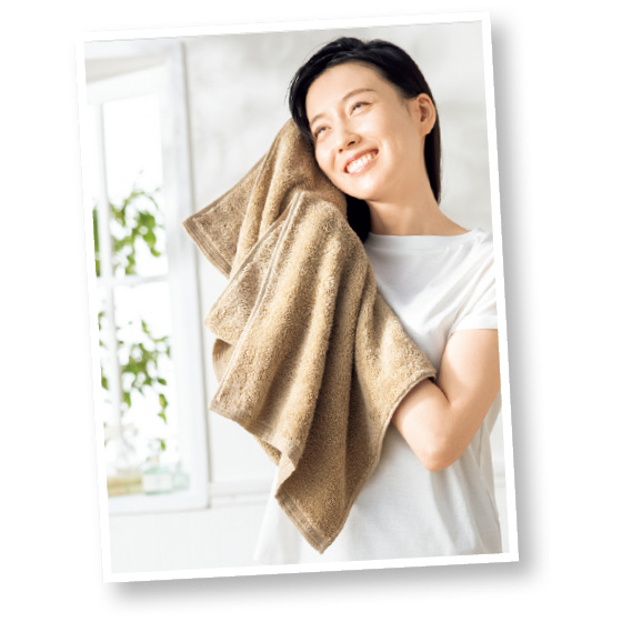 お風呂上がりの体はもちろん濡れた髪まで、全身をこの一枚ですばやく吸水。圧倒的な吸水力の秘密は、浅野撚糸(株)が5年もの歳月をかけて開発した膨らむ撚糸「スーパーZERO(R)」。繊維と繊維の間にすき間をつくり、空気をたっぷりと含んだ糸が、水分をぐんぐん吸収します。さらに、ふっくらとしたボリューム感があり、毛羽立ちしにくく、ふんわり軽く、やさしい肌触りです。