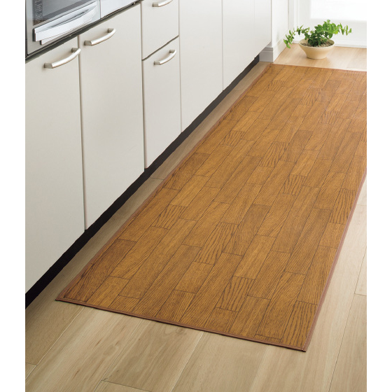 無垢材の床なので、台所の油はね、水はねが気になります。犬がいるので、毛が絡まない素材で拭き掃除しやすいものを選びますが、これは、色調も違和感なく、また、サイズも選べて助かります。飽きないデザインです。