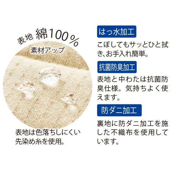 ●素材:綿100%(はっ水加工、抗菌防臭加工)、中材=ポリエステル100%(抗菌防臭加工)、裏面=不織布張り(すべりにくい加工、防ダニ加工)