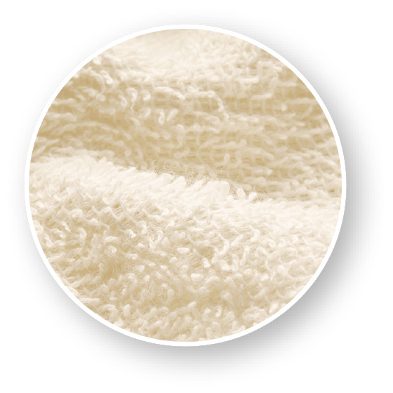 吸水性のよい綿100%(パイル部分)タオル地。入浴後の汗をしっかり吸収してくれる肌当たりのよいコットン。