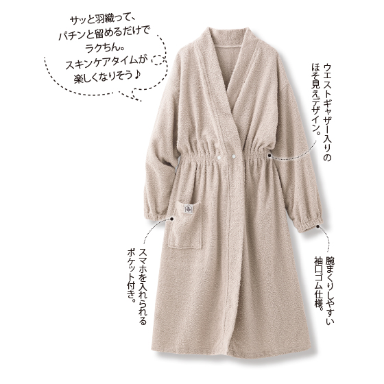 バスタオルの代わりになるバスローブがおすすめ。ふわふわの風合いにリラックス。