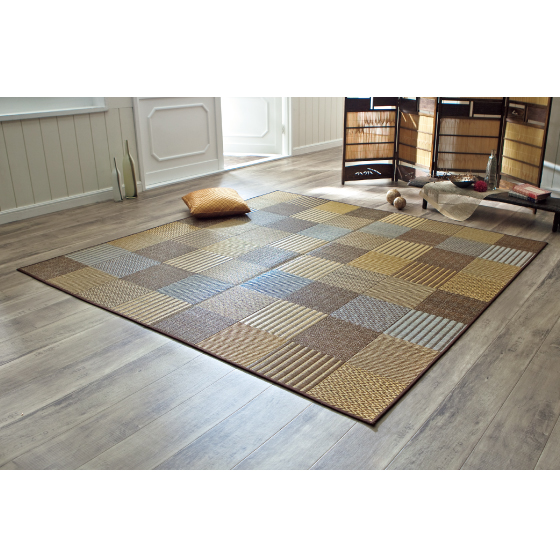 ●素材:い草100%(ひば加工)、ヘリ=ブルー/綿・麻、ベージュ・ブラウン/綿、裏張り付き裏面=不織布張り(すべりにくい加工)