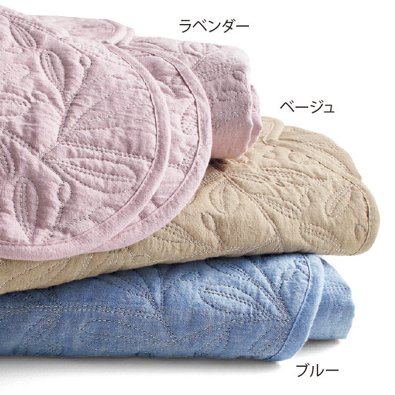 美しい色合いとやわらかな風合いが特長。繊細なコンピューターキルトで描き出したボタニカル柄と、縁のスカラップがおしゃれです。