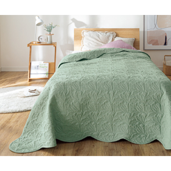 水洗いした先染め綿で、やわらかくサラリとした肌触り。繊細なコンピューターキルトでボタニカル柄を描き出しています。