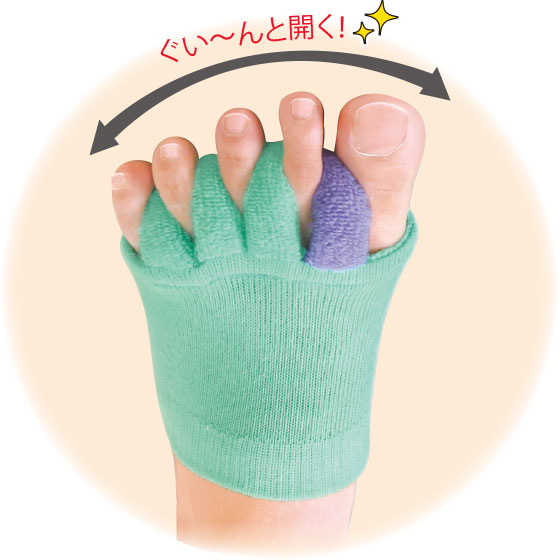 靴の中で縮こまりがちな足の指を、やわらかパイルで気持ちよ〜く広げてリラックス♪旅先やペディキュア時にも活躍します。