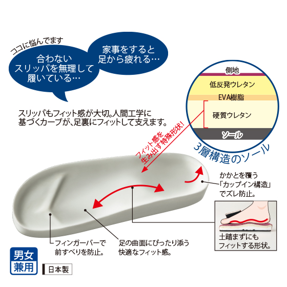 本品は靴インソール技師の井戸さんと増田徳雄商店が、人間工学に基づいてつくったこだわりのルームシューズ。「ジャストフィット」のために、サイズは1cm刻み。足裏の形に添ってなめらかな曲面を描くソールは、足の裏に心地よくフィットします。厚みのある底、やわらかいけれど沈み込まない独自のクッション性…まさに名前のとおりフット(足)快=B食事の支度など、「気づけば長い時間立っている」ときにこそ威力を発揮する逸品です。