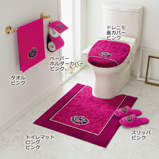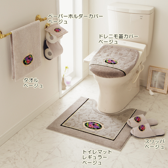 ●素材:マット・蓋カバー=パイル糸(黒)/モダクリル100%、パイル糸(その他)/アクリル100%、スリッパ・ペーパーホルダーカバー=綿75%・ポリエステル25%(ペーパーホルダーカバー成型部分=ポリプロピレン)、タオル=綿100%、裏面=マット/ホットメルト(すべりにくい加工)、蓋カバー/吸着シート(アクリル樹脂)