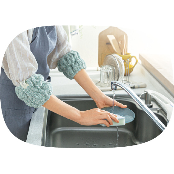 水仕事や洗面時、腕から水が伝ってあちこち濡れちゃうプチストレスを拭います。もこもこタオル地で、吸水性もしっかり!快適に使える抗菌防臭加工。