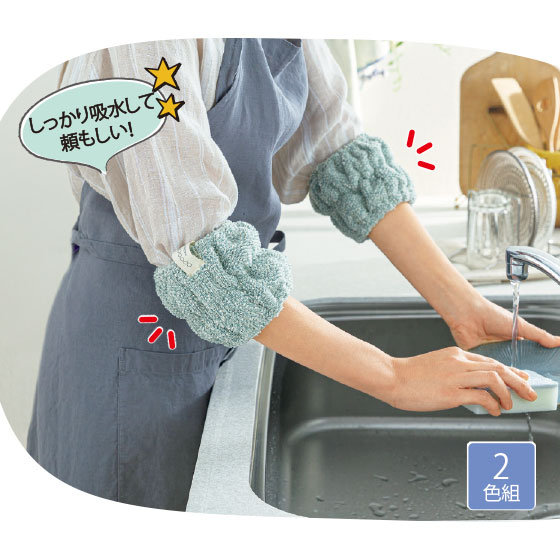 腕から水が伝ってあちこち濡れちゃうプチストレスを拭います。もこもこタオル地で、しっかり吸水。快適に使える抗菌防臭加工。