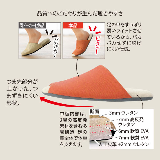 創業100年を超える履き物メーカーが手がけたこだわりの一足。見た目の美しさもさることながら、履き心地のよさに作り手の思いやりが詰まっています。甲や足裏に当たる部分は綿麻素材を使用し、ムレにくくさわやか。クッション性も高くしっかりと体を支えるので、家事で動き回っても疲れにくいのが特長です。信念のある素材選び、丁寧な縫製はもちろん、スリッパづくり一筋の実力が光っています。