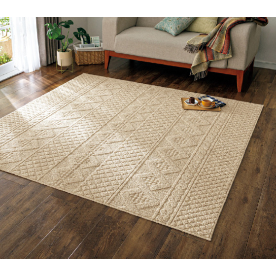 丸洗いできて、いつでも清潔。ぬくもりあるニット編み風デザインのウール混ラグ。