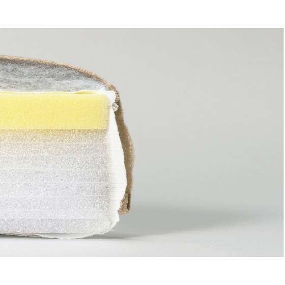 上部にポリエステルの中わた、中材に低反発ウレタン入りでやさしい座り心地。