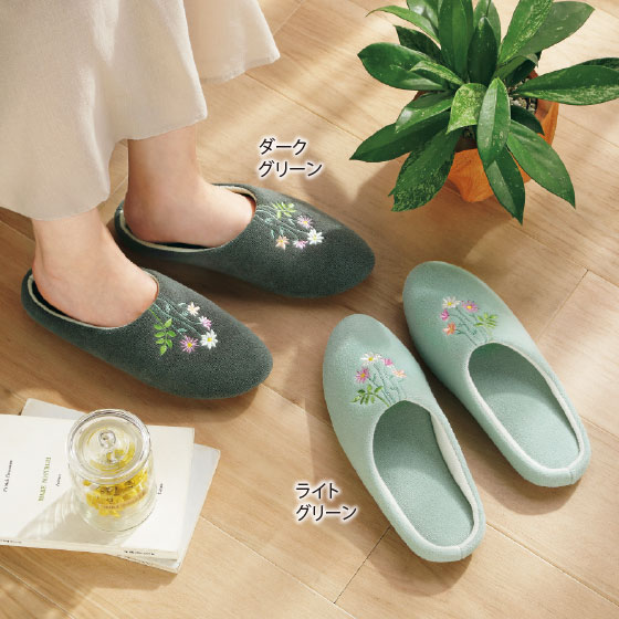 肌触りのよいソフトな綿パイル。繊細な花の刺繍がアクセントに。スエード調でパタパタ音がしにくい。