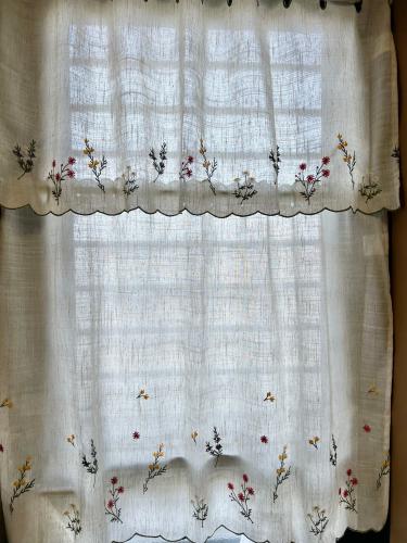 ナチュラルな麻混生地に可憐な草花を刺繍。ポールの通し穴とスカラップ部分も刺繍で縁取り、高級感を演出。