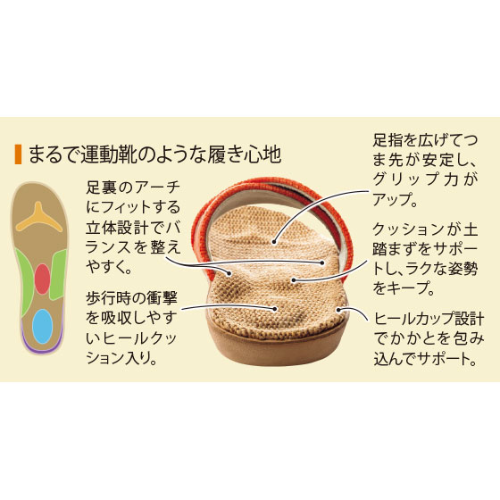 「もっとラクに家事がこなせるように」と足元への思いやりを追求。人の動きの特性を踏まえたこだわりのインソールで、長時間の立ち仕事・家事にもおすすめです。背筋がすっと伸びて歩きやすい姿勢へサポートします。