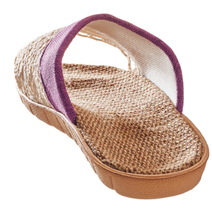 中板はざっくりとしたジュート混で足裏サラサラ。甲部分はトーションレースと表情豊かなスラブ生地の切り替えで通気性がよく見た目も涼しげ。汗ばむ季節も心地よくさわやかな足元に。足の形に成型されたインソールが足裏にフィット。パタパタしにくく歩きやすい。底面はクッション性があるEVA素材。踏み心地快適、汚れたら拭くだけ。