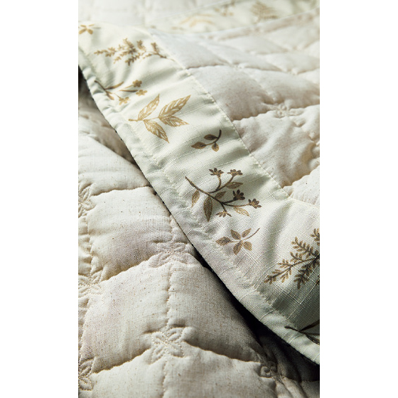 表地(額部分除く)は肌触りのよい綿麻素材で、サラリとした清涼感のある風合い。額部分に上品なボタニカル柄をあしらったデザインがインテリアに溶け込みます。