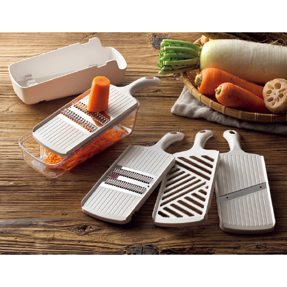 ちょっとお高いかなあと思いましたが、コンパクトにまとまっているので買ってみました(以前ドイツ製の何万円もするのを買いましたが、大きすぎて収納にも困ったので)。ボールや器に引っ掛けて固定することができたり、野菜などに取り付けて安全に使用できる持ち手がついているので安心です。これに変えてから野菜を細かくして料理に混ぜ込んだ物をよく使って、野菜を残すことがなくなりました。ただ、切れ味はドイツ製の方が良かったように思います。大根とかは全然オッケーですが、人参を千切りにするのに以前よりほんの少し力が要る気がします。なので使用感は星4つになりました。
