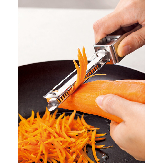 調理に欠かせないスライサー。でも、よくあるプレートタイプは付属品が多くて面倒だったりしませんか?本品は一見普通の大きめピーラーですが、実は表と裏で異なる2種の刃があります。しかも切れ味は包丁並み。通常の皮むきやスライスはもちろん、ギザ刃を使えば細切りだってサクッとでき上がり。お鍋やボウルの上で手軽にカットできるから、包丁・まな板要らずで後片づけもラク。上手に使えば時短調理に!