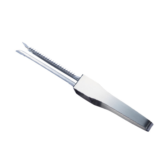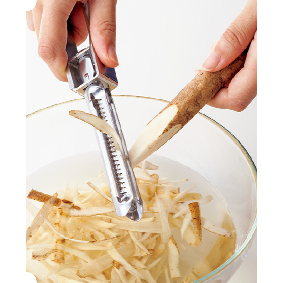調理に欠かせないスライサー。でも、よくあるプレートタイプは付属品が多くて面倒だったりしませんか?本品は一見普通の大きめピーラーですが、実は表と裏で異なる2種の刃があります。しかも切れ味は包丁並み。通常の皮むきやスライスはもちろん、ギザ刃を使えば細切りだってサクッとでき上がり。お鍋やボウルの上で手軽にカットできるから、包丁・まな板要らずで後片づけもラク。上手に使えば時短調理に!