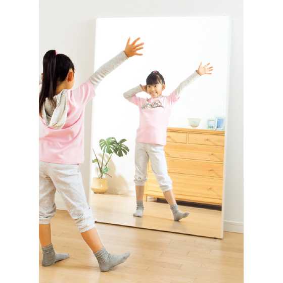 世の中にミラーは数あれど、本品が“ベストワン”たる所以は「何があっても割れないこと!」。秘密は鏡面部の素材。「フィルムを使っているから、お子様がぶつかったり、地震のときにもガラスのように割れて飛び散るという心配がないんです」(商品担当・武本)。気になるその映りですが、職人2人体制で1枚ずつフィルムを張るという国産ならではの手仕事により、一般的なフィルムミラーで心配される歪みを極限まで出にくくしているのだとか。しかも、女性が片手で持ち上げられるほど軽い!左右端には縁付き。