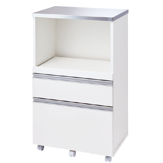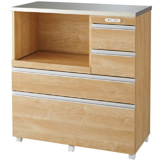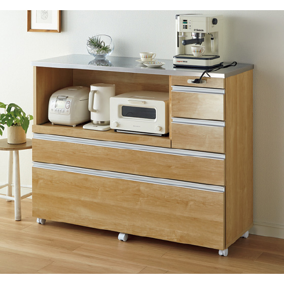 家電や食器、調理器具などがまとめてしまえるスグレもの。スライド棚を引き出して、その場で調理用家電が使えます。天板上に電子レンジを置けば使いやすい高さになります。