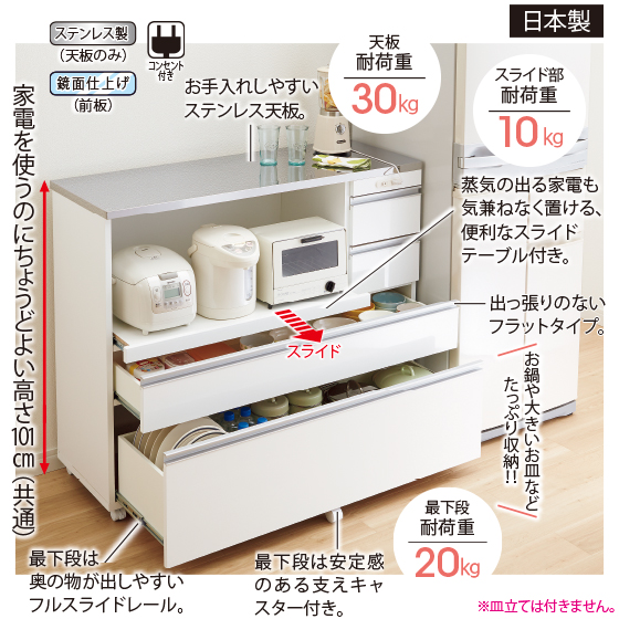 ●耐荷重:天板=30kg、スライド部=10kg、最下段=20kg