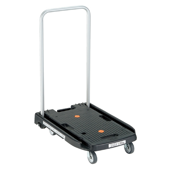 取り扱いやすい軽量タイプながら、均等耐荷重100sの頑丈キャリー。ハンドルをたためば平台車にも。