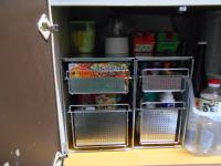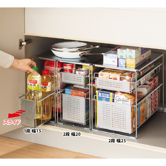シンク下をムダなく使う!スライド式で奥の物も出し入れ簡単です。