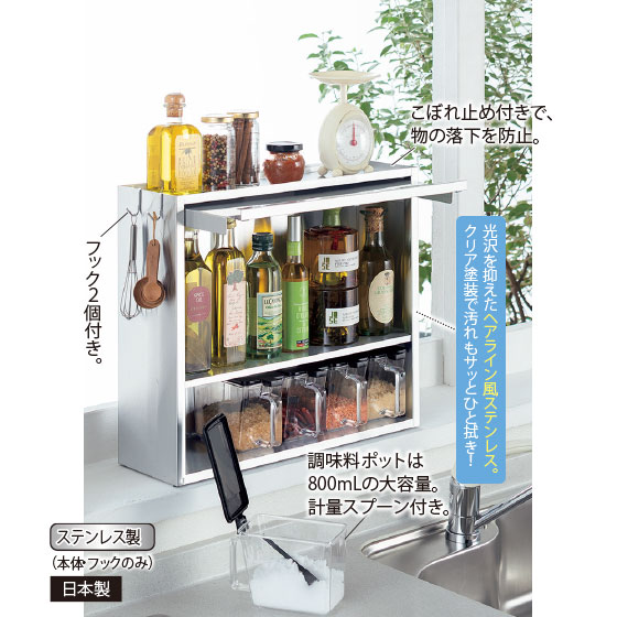 ●材質:本体・フック=ステンレス鋼(扉のみクリア塗装)、ポット=ポリスチレン、ポット蓋・計量スプーン=ポリプロピレン