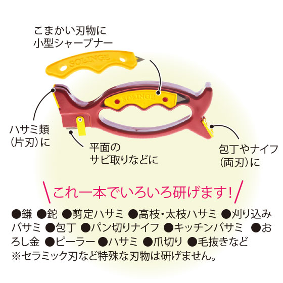 研ぎ器の部分が刃に合わせてフレキシブルに動くピンチング方式だから、通常研ぎにくいギザ刃の包丁もOK。家庭内の刃物はおまかせです。