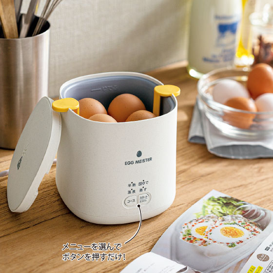お水と卵を入れて、スイッチオンするだけ! 張り付いていなくても、火加減が難しい温泉卵からミニオムレツまで、待つだけで簡単!