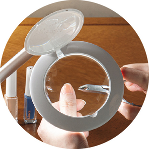 拡大鏡は2.25倍と4.0倍。用途に応じて使い分けができ、こまかい文字の読み取りや糸通しなどもすんなりと。