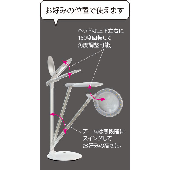 拡大鏡は2.25倍と4.0倍。用途に応じて使い分けができ、こまかい文字の読み取りや糸通しなどもすんなりと。照明で物体を照らした時に、より自然な色で見ることができ、淡い色も色鮮やかにくっきり見える。