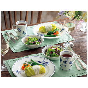 白磁に青色が美しいブルーオニオン柄は、洋食・和食を問わず幅広く使えます。大きめのカップはコーヒーやお茶にも。プレートも縁が高めで使いやすい大きさです。