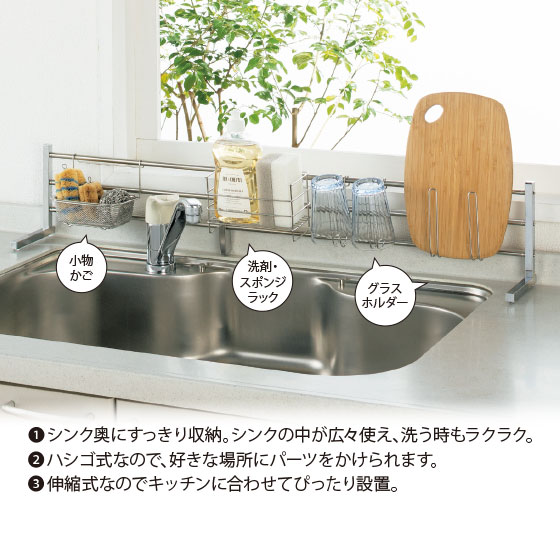 ●サイズ:幅80〜120×奥12.5×高16.5cm、洗剤・スポンジラック=幅16.2×奥9.5×高10cm、グラスホルダー=幅8.5×奥4.5×高12cm、小物かご=幅14.5×奥9.6×高5.2cm