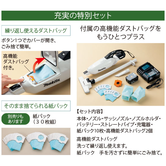 ●バッテリー、充電器、ノズル、ストレートパイプ、サッシノズル、ノズルホルダ、高機能ダストバッグ2個、紙パック10枚付き