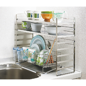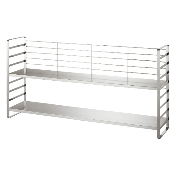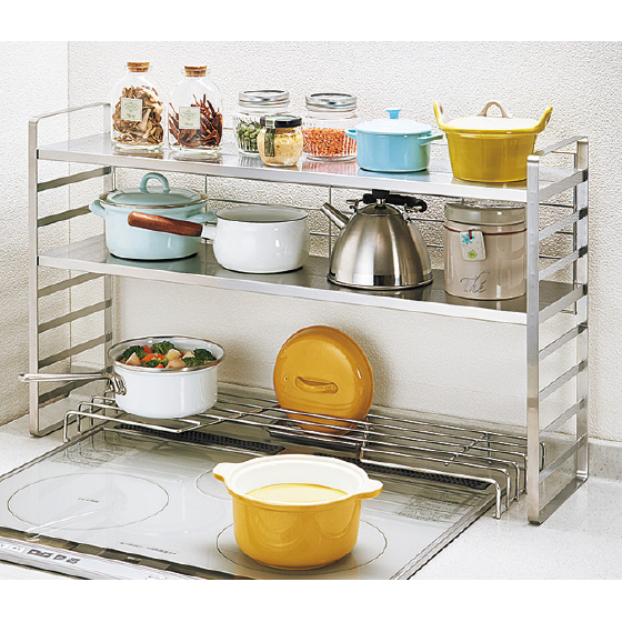 サビに強く、丈夫なオールステンレス製。棚板は5pピッチで8段階に調節可能。落下防止のバックネット付き。丸洗いもOKです。