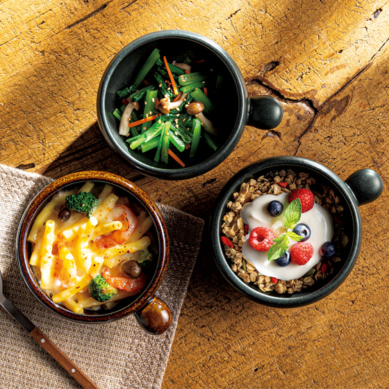 和え物やデザート、スープカップなど用途はいろいろ。オーブン料理にも使えます。裏に凹みがあり、持ちやすい取っ手。
