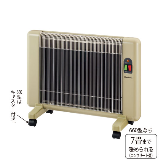 ●材質:本体=鋼板・ステンレス鋼(ポリエステル樹脂系粉体塗装)、遠赤外線放射板=ホーロー、ガード=金網にメッキ・上部フロッキー(植毛)加工、スイッチパネル=ABS樹脂、キャスター(660型のみ)=ABS樹脂、電源コード・配線材の一部=塩化ビニール、ダストカバー=不織布、電源ランプ=LED