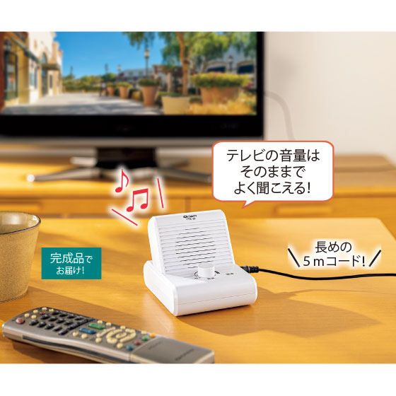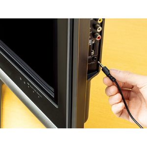 難しい設定は不要、イヤホンのようにつなぐだけですぐに使えます。コードは5mの長さなので、少々離れた所からでも大丈夫。電源はACアダプターと乾電池の2通りが使えます。