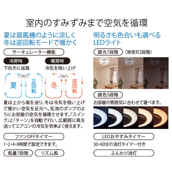 風も灯りもお好みで調整OK。エアコンの冷気を部屋全体に拡散!