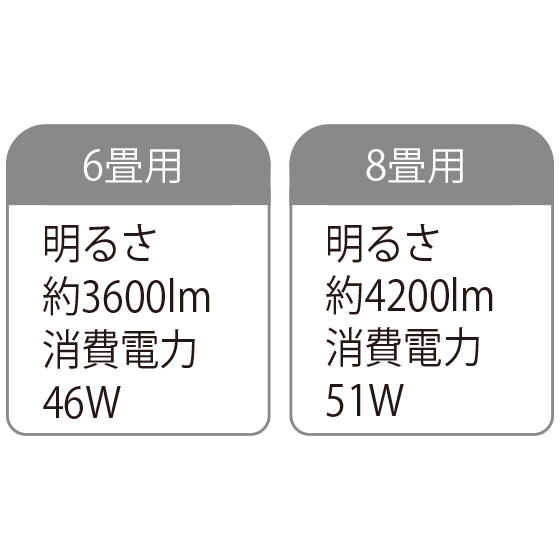 ●消費電力:6畳用=46W(ファン部/13W・LED部/33W)、8畳用=51W(ファン部/13W・LED部/38W)