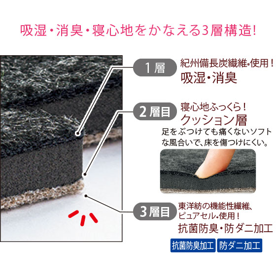 吸湿・消臭・寝心地をかなえる3層構造!紀州備長炭繊維(R)使用!吸湿・消臭。寝心地ふっくら!クッション層で、足をぶつけても痛くないソフトな風合い。床を傷つけにくい。東洋紡の機能性繊維、ピュアセル(R)使用!抗菌防臭・防ダニ加工。