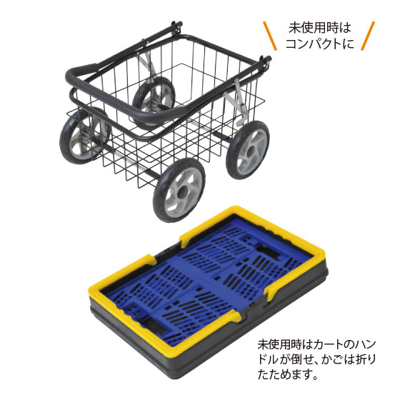 かごは取り外せて、手持ち移動もOK!未使用時はカートのハンドルが倒せ、かごは折りたためます。